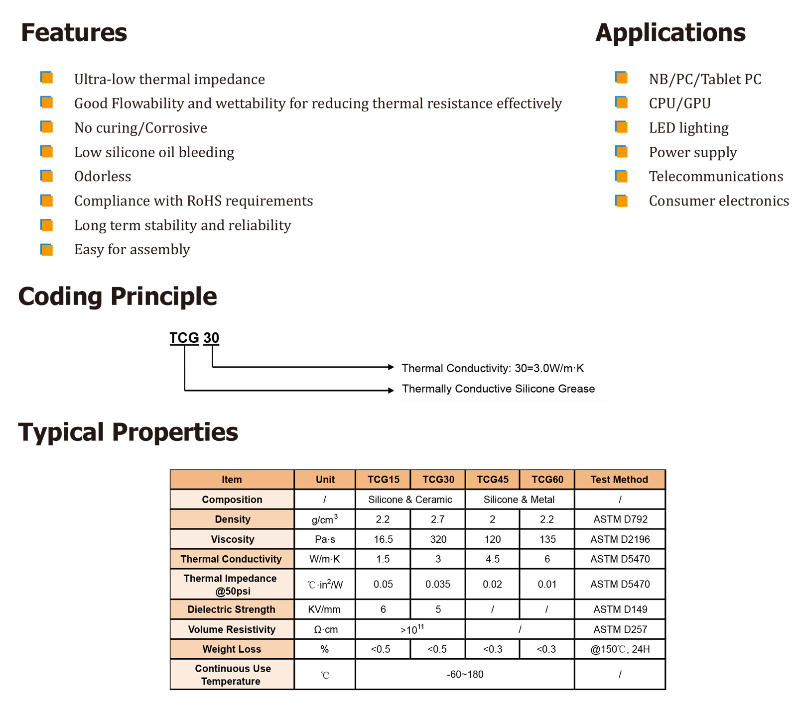 TCG系列是一種導(dǎo)熱性高、熱阻低的導(dǎo)熱硅脂,適用于需要改進(jìn)散熱的部件。非常適合用于CPU、GPU冷卻以及功率半導(dǎo)體組件和散熱,其中熱阻是主要問(wèn)題。