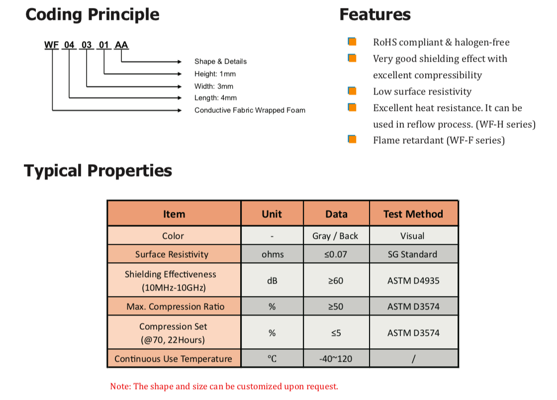 TMWF系列導電布包裹泡棉由高導電布、PU泡棉芯和導電壓敏丙烯酸粘合劑組成。這些高度可壓縮的材料專門設計用于提供卓越的EMI屏蔽和接地性能,并且可以提供優(yōu)秀的防塵和防潮保護。WF系列產(chǎn)品極易調整尺寸,適用于計算機、智能手機、液晶顯示器和電信制造行業(yè),如固定墊圈。" />